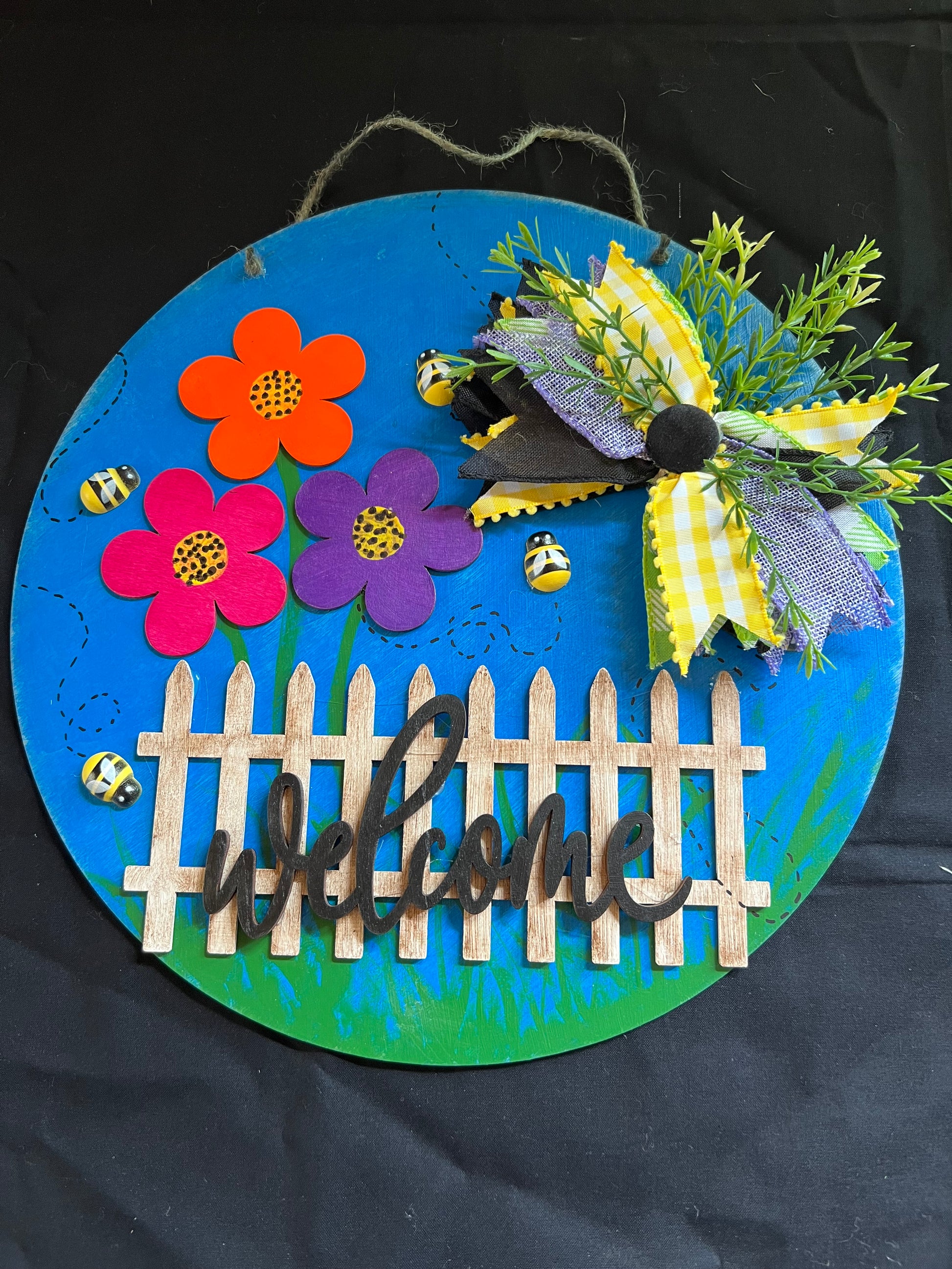 Flowers, bees and a picket fence. This is a 14” in diameter wooden circle. This sign is sealed and ok for outdoor use.